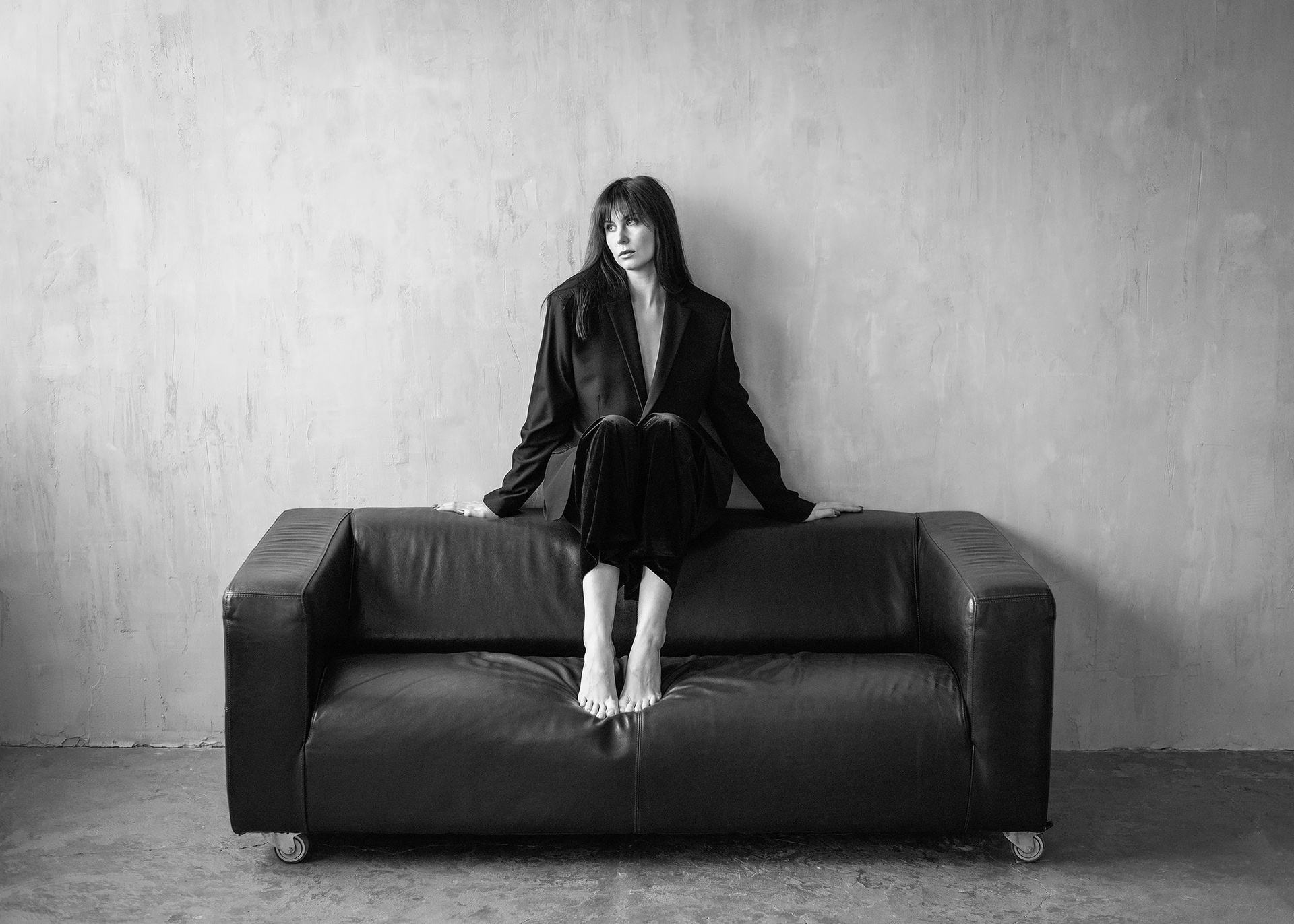 Я предложил двухчасовую съемку в минималистичном зале в одной из фотостудий Новосибирска. 2 часа достаточно, чтобы не спешить, переодеться три раза и получить удовольствие от съемочного процесса. Из одежды выбрали платье-комбинацию, пиджак, синие джинсы и белый топ, без излишней вычурности и яркого мейка, чтобы передать спокойные и нейтральные атмосферу и эмоции.